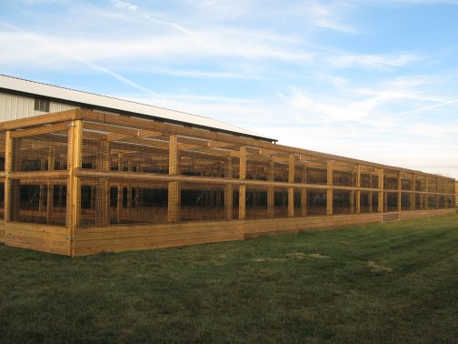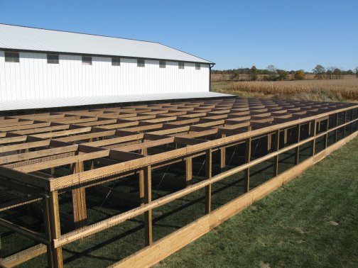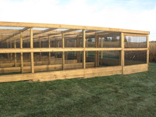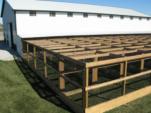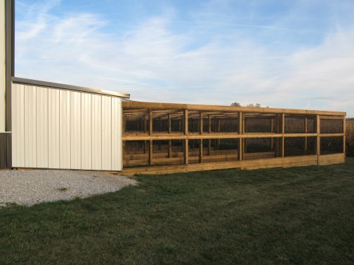 | Our New Aviary Facility!!Our new facility is complete!! Our barn is a 48'x96' Wick pole barn, built by B&B Construction, a local contractor. The barn has 12-8'x8' box stalls for peafowl. The cement floor has hot water radiant heat, designed by local contractor, Bader Mechanical, to enable us to more easily raise all three species of green peafowl in our cold midwestern winter weather. Each box stall has an outdoor flight pen, designed by us, and constructed by B&B Construction. Flight Pen Construction Article © 2006, Hopkins' Alternative LivestockWeb site designed and maintained by Lisa Hopkins