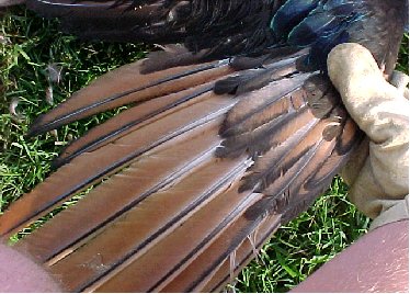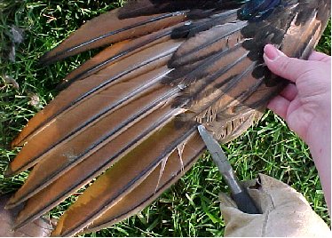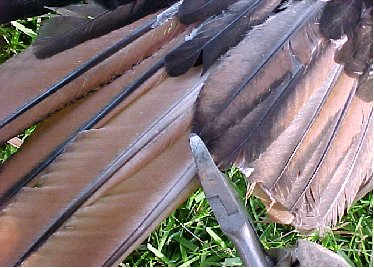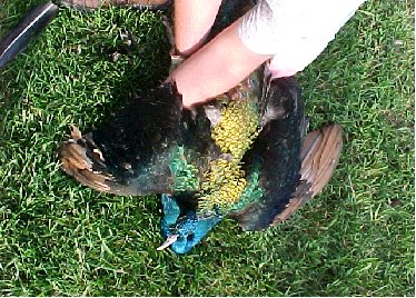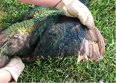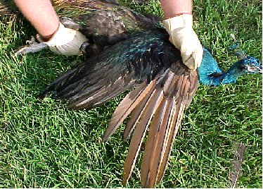 Peafowl Wing ClippingHold the bird with a firm grip on both legs. Open up the wing to be clipped to expose the flight feathers. Wire cutters or sharp scissors are used to cut the feathers. Cut one feather at a time, using the small tertiary feathers as a guide. Use the tertiary feathers as a guide to prevent cutting too close to the wing bone. Continue cutting across the wing. Clip only one wing on each bird.Wing feathers will grow back in 4-5 months. © 2005, Hopkins' Alternative LivestockWeb site designed and maintained by Lisa Hopkins