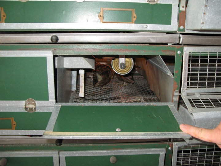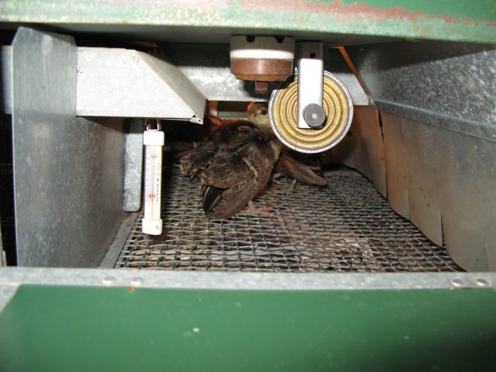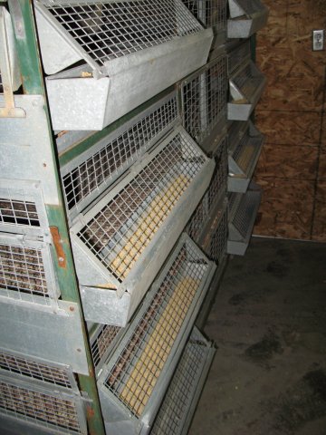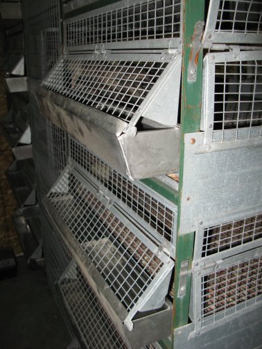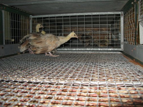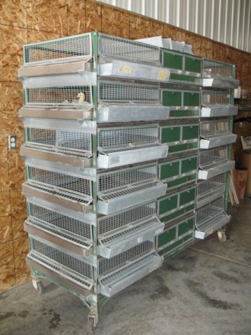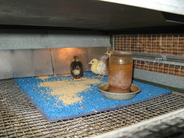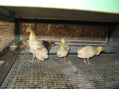 BroodersWe use multi-layer stack brooders for all of our peachicks until they are approximately 6 weeks old. Each brooder layer is thermally controlled so that chicks from a day old up to 6 weeks old are slowly acclimated to life in the real world. The rule of thumb in brooding chicks is to reduce the brooder temperature by 5 degrees for each week of age, starting at 95 degrees for the first week. These multi-layer brooders have wire floors which helps keep the chicks healthy because droppings fall through the wire to the catch pans below. Also, the brooders have water and feed troughs on the outside of each layer. The chicks are then moved to a Petersime grower unit which allows them to adjust to the larger seasonal temperature changes. © 2010, Hopkins' Alternative LivestockWeb site designed and maintained by Lisa Hopkins