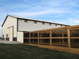 the pens, leading away from the pole barn, are covered with metal, siding that