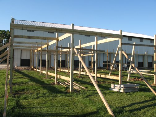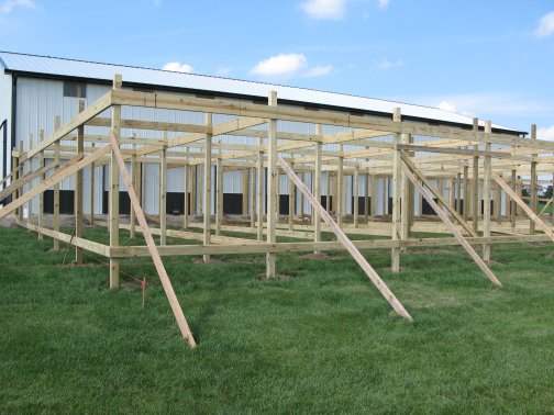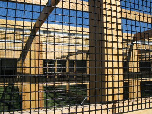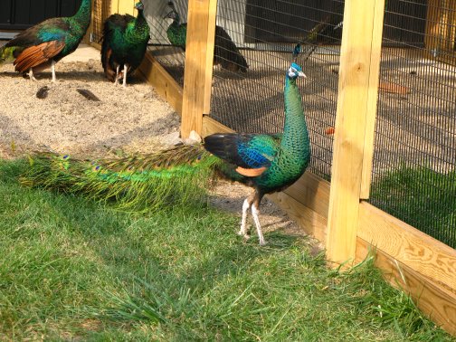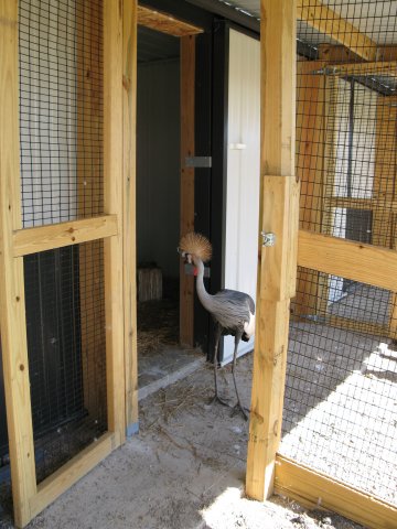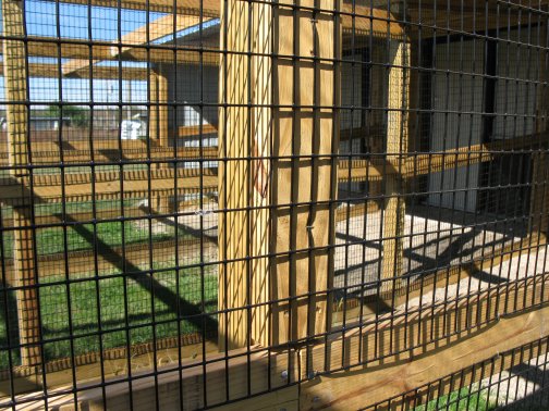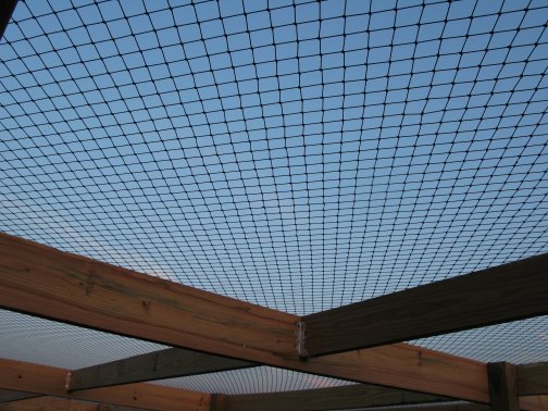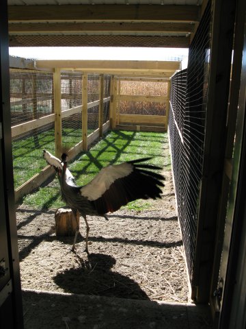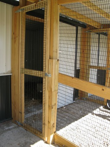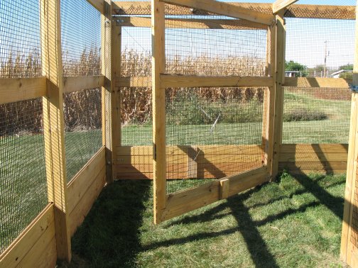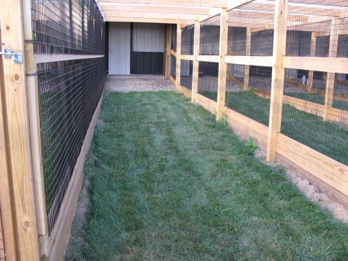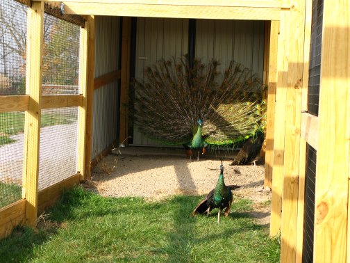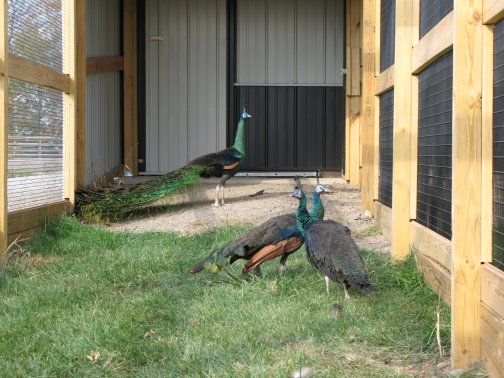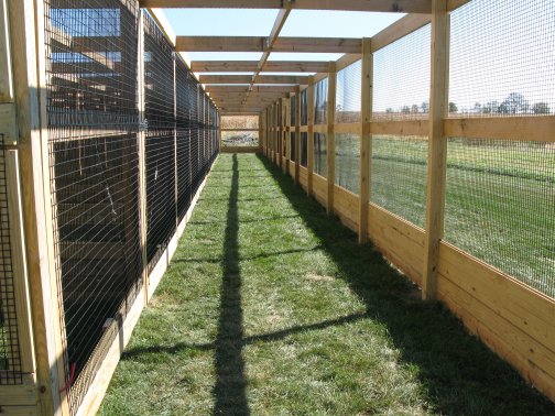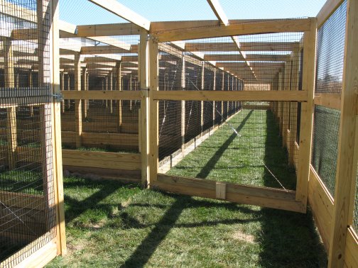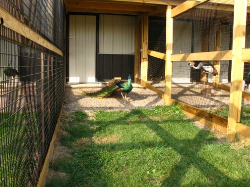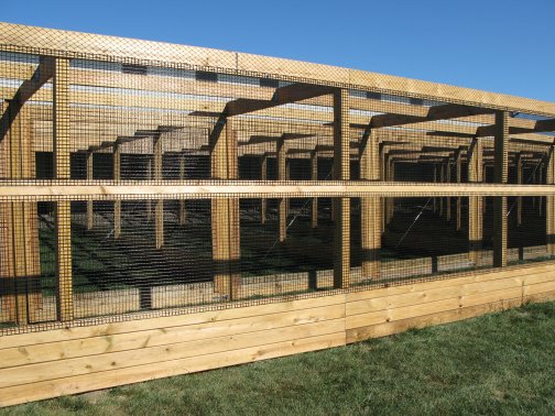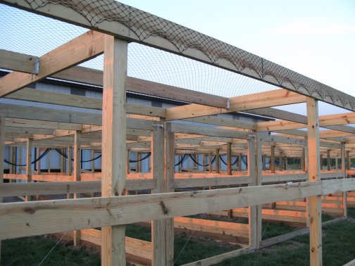 Flight PensPeafowl Flight Pen Construction Article The pictures below show our flight pens and the article link above discusses the specific design features and construction of the pens. The wire for our pens was supplied by K&D Cage of New Castle, IN. The netting used for our pens was supplied by Pacific Netting Products of Washington. The wood structure for our flight pens is MCQ treated lumber. A system of aisleways and gates is used to move birds from pen to pen. Small walk through gates allow us to move from pen to pen without using the large gates at the end of each pen. One inch knotted netting is used to cover the top of the flight pens. Knotted netting is a good choice for areas of the country that get snow as it allows snow to pass through rather than accumulate on the top of the netting. PVC coated welded wire is used for the sides of the pens. One by one wire mesh is used for the exterior panels and one by two on the interior. Our flight pens are on the south side of our facility to allow the birds to enjoy as much nice weather as possible while protecting them from the elements. We have built a covered roosting area in each pen to provide shade and protection from the elements while still allowing the birds to be outside. © 2008, Hopkins' Alternative LivestockWeb site designed and maintained by Lisa Hopkins