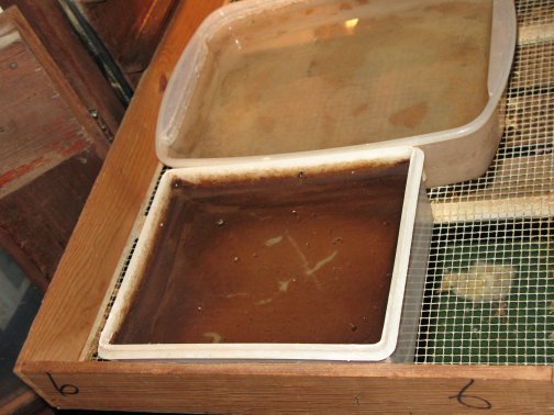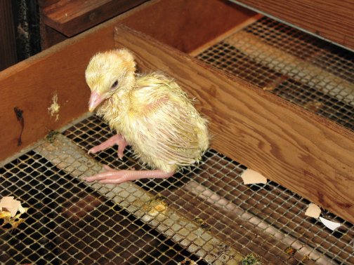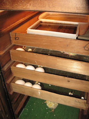 HatcherEggs are placed in the hatcher trays by variety to keep the chicks separate until they can be wing tagged. Astroturf mats are used in the bottom of the hatcher to ensure that the chicks have good footing as they dry off and gain strength in their legs. This helps prevent slipped tendons, spraddled legs, and crooked toes. The chicks remain in the hatcher for one day after hatching. Two water pans are used in the hatcher to raise the humidity to help the chicks during hatching. A hatcher is simply an incubator in which the trays do not tilt, eggs are not turned, humidity levels are elevated, and eggs are separated by variety. A hatcher is a very valuable tool since it can be cleaned and disinfected easily after each hatch of chicks. © 2008, Hopkins' Alternative LivestockWeb site designed and maintained by Lisa Hopkins |
