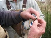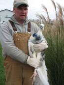 The first step in this process is to catch the peafowl and to properly restrain them so that they don’t injure themselves or you. I use a large fishing net with a long retractable handle to catch the bird. The net material is not the normal coarsely woven nylon mesh. I use a tightly woven nylon mesh made especially for catching birds. Entire nets or just the mesh material can be purchased from most poultry or pheasant supply companies. Once the bird is caught, pin the bird to the ground with the net and grasp both legs firmly with a gloved hand. It is best to grasp both legs at the knee joint and to hold both legs in one hand. Remove the bird from the net and cradle it against your body so that it can’t flap its wings.
