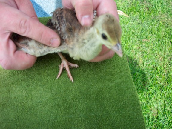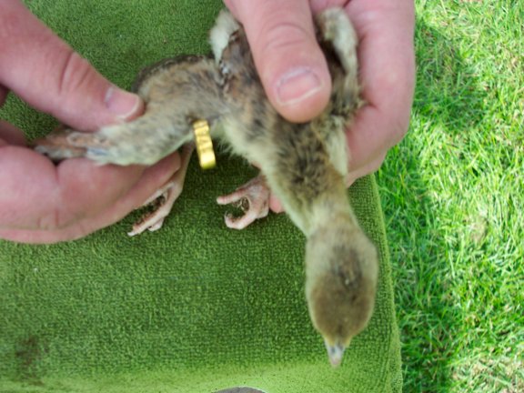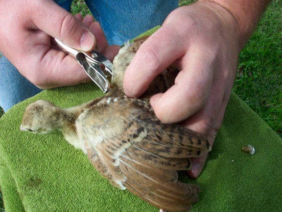 Peachick Wing TaggingNational Band Co., Jiffy style 893 tag and applicator. Locate tag in the front of the wing, approximately 1/8" from the front. Crimp tag into wing, until tag is completely closed. Check that tag is securely imbedded in the wing. We apply a tag to each wing to ensure identity. © 2005, Hopkins' Alternative LivestockWeb site designed and maintained by Lisa Hopkins