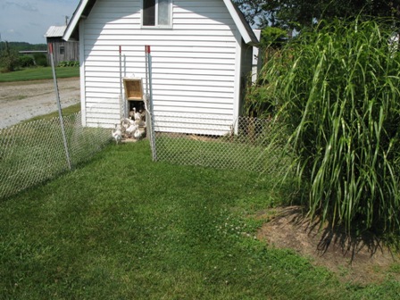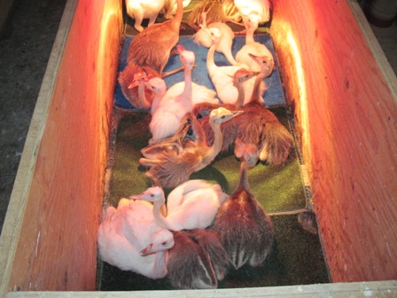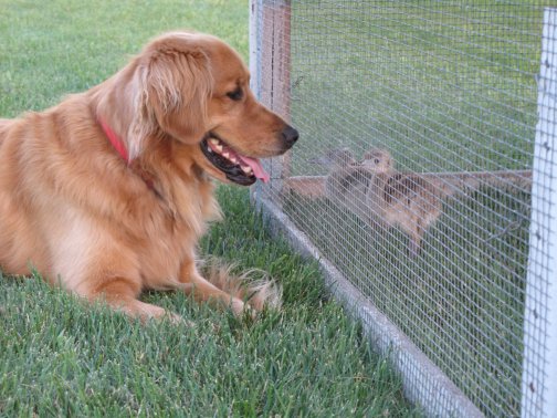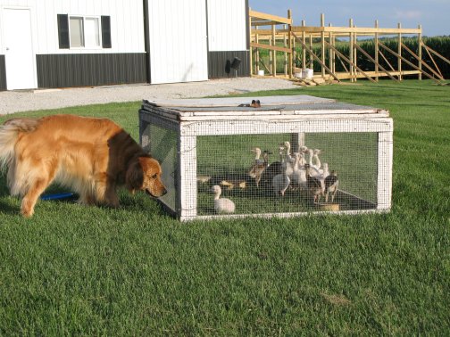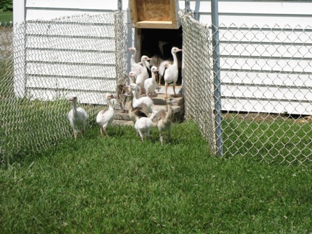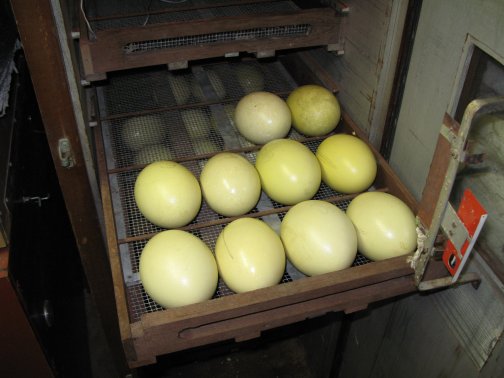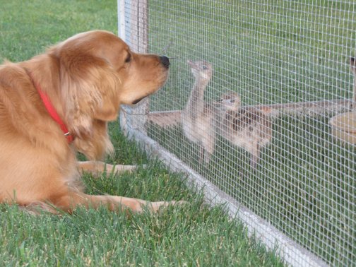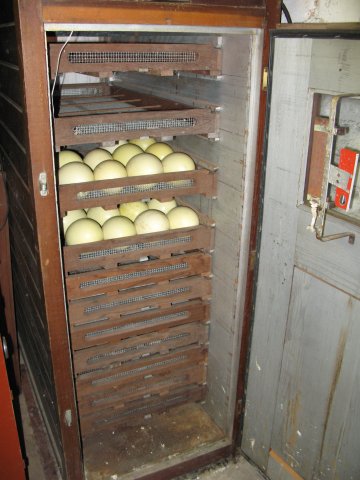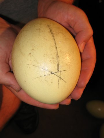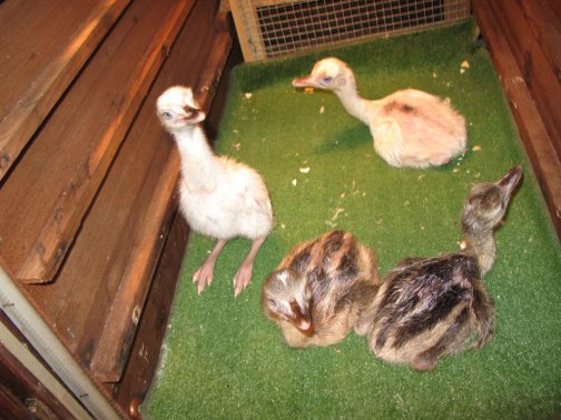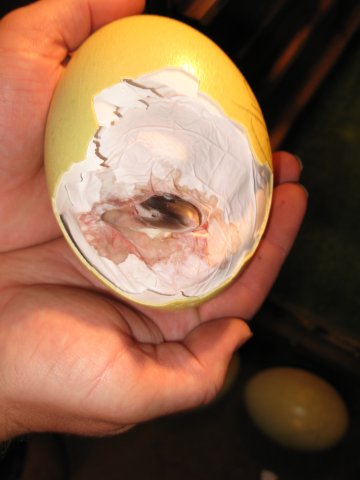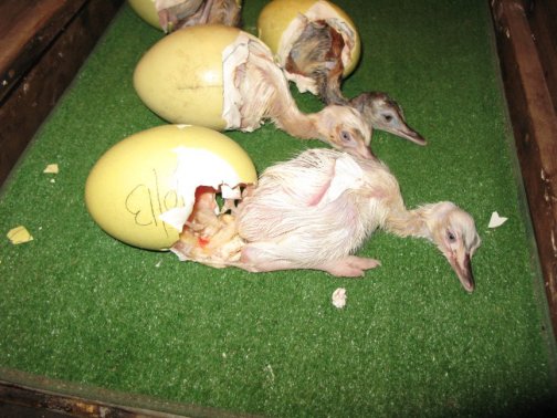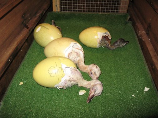 use of this information by others than Hopkins' Alternative Livestock. Rhea eggs are incubated in redwood incubators at a humidity level of 50% and a temperature of 99.5 degrees F. Eggs are turned by hand three times a day. Incubation takes 34-35 days. The following six photos show how to hatch a rhea egg. The first step is to be patient! This process will take at least a day to complete. The egg is candled in order to find location where the chick has pipped the inner membrane. By allowing the chick to pierce the inner membrane this will minimize any bleeding of the membrane. The spot is then marked with a X. Then, at the X, the shell is broken away to the extent of the air space remaining in the shell. Do not tear away the membrane any more than the chick already has. If too much of the membrane is torn while it is still wet, excessive bleeding will occur which weakens the chick and can be fatal to the chick. Once the shell is broken away, the egg is placed back in the hatcher for approximately 12 hours. Remove the egg and spray the membrane with a fine mist of water. Gently peel the membrane back to the line of the already broken shell. Gently grasp the chick's beak and pull the head and neck out of the shell. Place the egg back in the hatcher and allow the chick to complete hatching on its own. Allowing the chick to struggle to hatch will ensure that the remaining yolk sack is completely pulled inside the chick's belly. Rhea chicks are hatched in redwood incubators used as hatchers. Eggs are moved from the incubator to the hatcher at 35 days and are no longer turned. Eggs normally hatch at 36-38 days. Chicks are placed in a homemade brooder after one day in the hatcher. A heat lamp is used for warmth and astroturf mats are used to provide good footing. Chicks are started on a medicated started feed and chopped lettuce or clover leaves. We have found that adding an incandescent light to brighten the inside of the brooder building will draw the chicks inside at dusk or when the weather is overcast and rainy. The chicks will come inside to warm up and associate the incandescent light with warmth. The radio is an extremely valuable tool used to calm the chicks. The radio playing sensitizes the chicks to noise and overall, results in much calmer chicks as well as adults. As soon as weather permits, the chicks are moved to an outside brooder pen during the day. Chicks are kept in heated brooder at night. The most important thing for rhea chicks is to have a golden retriever guard dog. Forget those Great Pyrenees!! Golden Retrievers Rule!! In our experience, the keys to healthy rhea chicks are plenty of exercise, limited feed, and plenty of sunshine! © 2010, Hopkins' Alternative LivestockWeb site designed and maintained by Lisa Hopkins